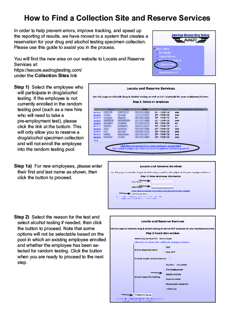 How to Find a Collection Site and Reserve Services In order to help prevent errors, improve tracking, and speed up the reporting of results, we have moved to a system that creates a reservation for