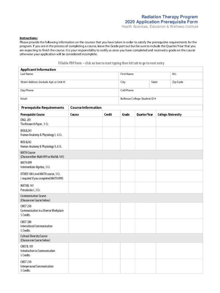 Radiation Therapy Program 2020 Application Prerequisite Form Health Sciences, Education & Wellness Institute Instructions: Please provide the following information on the courses that you have taken