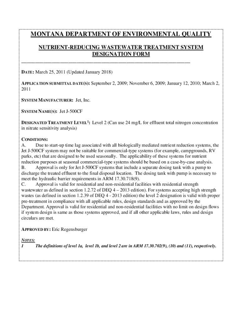 Get the free nutrient-reducing wastewater treatment system designation form - deq mt