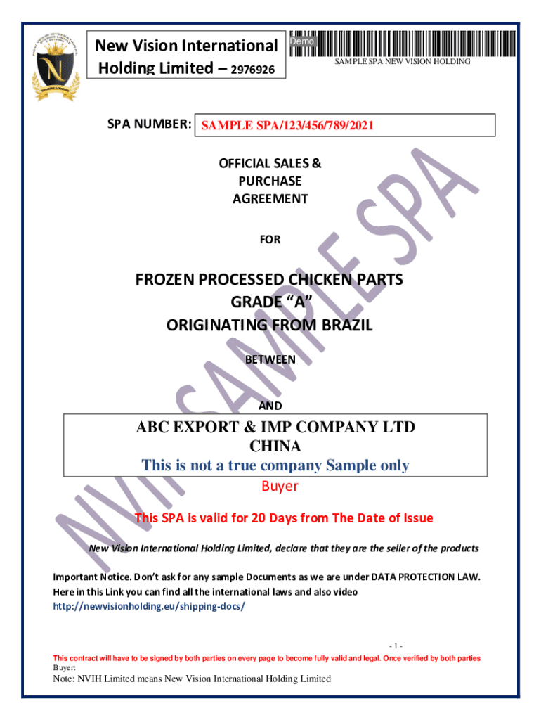 New Vision International Holding Limited 2976926. Demo SAMPLE SPA NEW VISION HOLDINGUnder: Malta Head Office SPA NUMBER: SAMPLE SPA/123/456/789/2021 OFFICIAL SALES & PURCHASE AGREEMENT FROZEN PROCESSED
