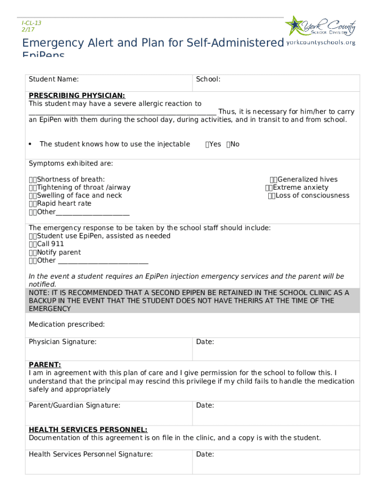 Template I-CL-13 Emergency Alert and Plan for Self-Administered EpiPens instructions