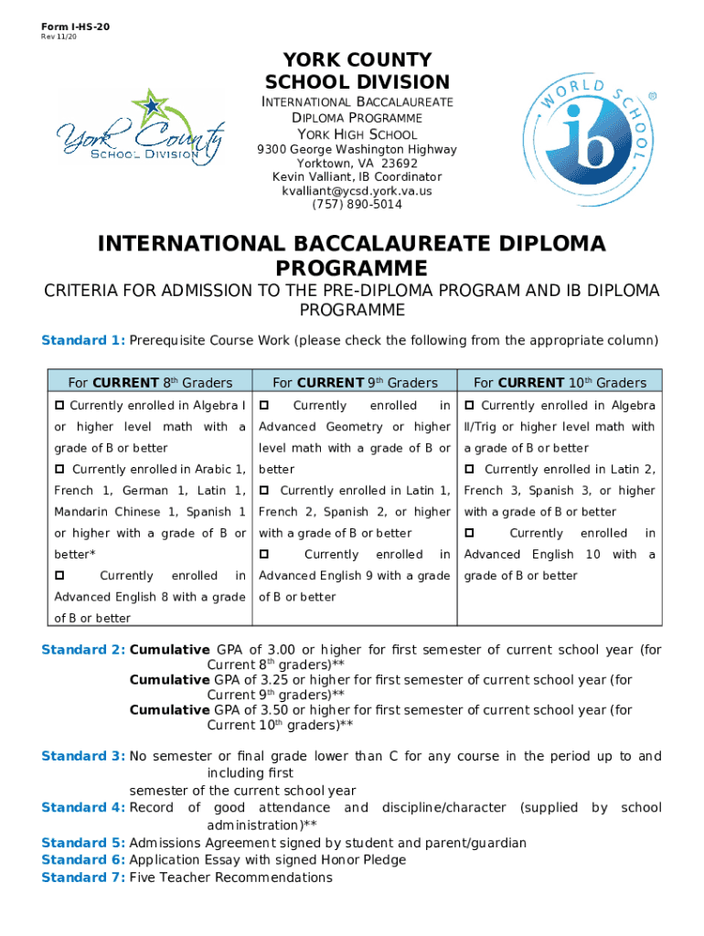 What is I-HS-20 Criteria for Admission to the IB Programme - York County School ... Form?