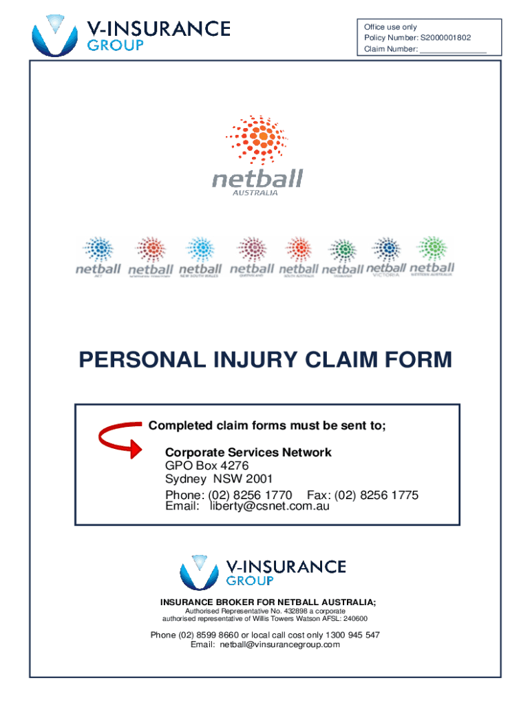 Office use only Policy Number: S2000001802 Claim Number:PERSONAL INJURY CLAIM FORM Completed claim forms must be sent to; Corporate Services Network GPO Box 4276 Sydney NSW 2001 Phone: (02) 8256 1770