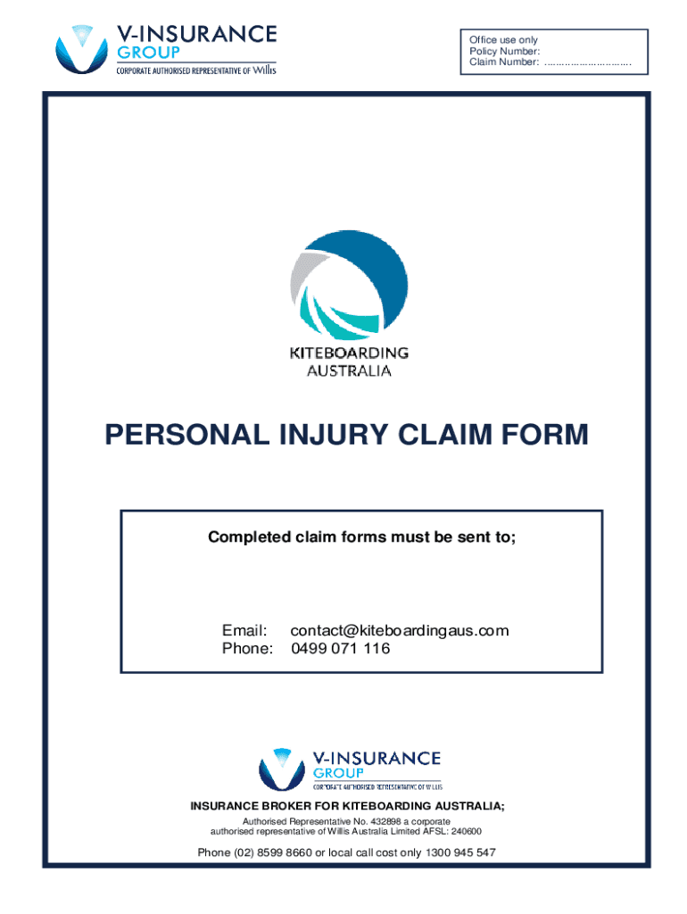 Office use only Policy Number: Claim Number: ..............................PERSONAL INJURY CLAIM FORMCompleted claim forms must be sent to;Email: Phone:contact@kiteboardingaus.com 0499 071 116INSURANCE