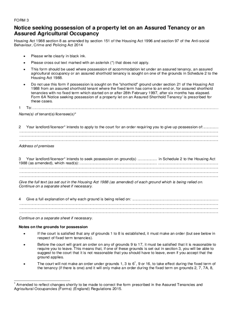 FORM 3Notice seeking possession of a property let on an Assured Tenancy or an Assured Agricultural Occupancy Housing Act 1988, section 8 as amended by section 151 of the Housing Act 1996 and section