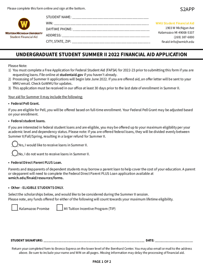 PSP S2APPPlease complete this form online and sign at the bottom. STUDENT NAME: ___ WIN: ___ DAYTIME PHONE: ___ ADDRESS: ___ CITY, STATE, ZIP: ___WMD Student Financial Aid 1903 W Michigan Ave Kalamazoo