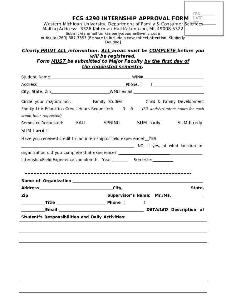 The 4290APPROVAL.FST - Western Michigan University is a Word document needed to be submitted to the specific address to provide specific info. It has to be completed and signed, which is possible manually, or with a certain solution such as PDFfiller. This tool lets you fill out any PDF or Word document directly in your browser, customize it according to your purposes and put a legally-binding electronic signature. Right away after completion, you can easily send the 4290APPROVAL.FST - Western Michigan University to the appropriate individual, or multiple individuals via email or fax. The blank is printable as well due to PDFfiller feature and options presented for printing out adjustment. Both in digital and physical appearance, your form will have got organized and professional appearance. Also you can turn it into a template for further use, without creating a new document from the beginning. You need just to amend the ready template.