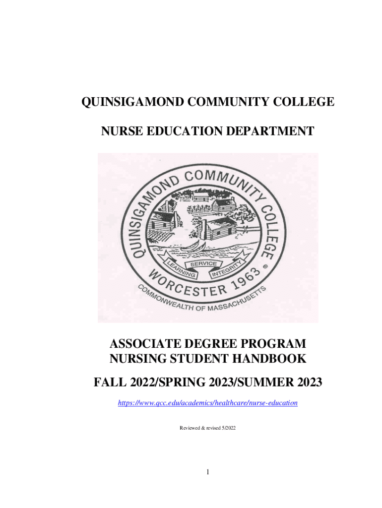 QUINSIGAMOND COMMUNITY COLLEGE NURSE EDUCATION DEPARTMENTASSOCIATE DEGREE PROGRAM NURSING STUDENT HANDBOOK FALL 2022/SPRING 2023/SUMMER 2023 https://www.qcc.edu/academics/healthcare/nurseeducation