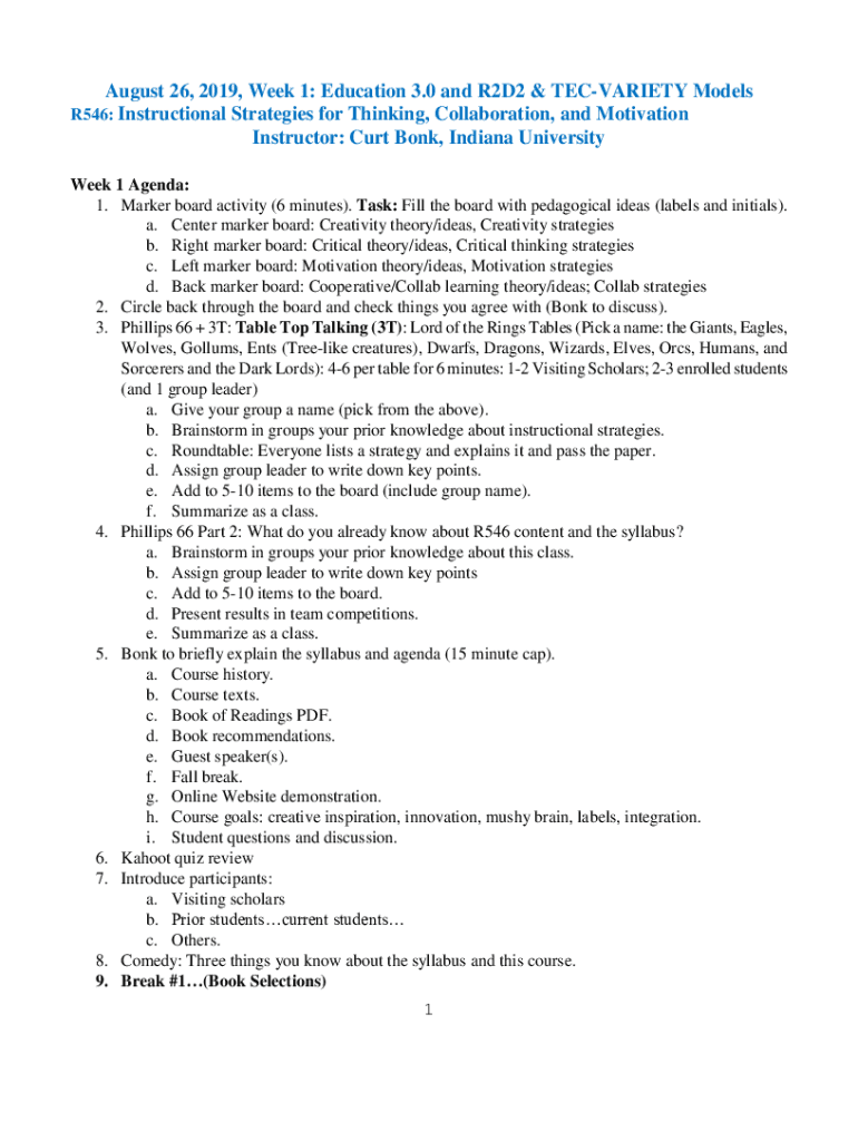 August 26, 2019, Week 1: Education 3.0 and R2D2 & VARIETY Models R546: Instructional Strategies for Thinking, Collaboration, and Motivation Instructor: Curt Bonk, Indiana University Week 1 Agenda: