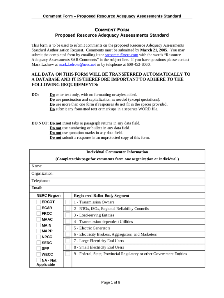 The ALL DATA ON THIS WILL BE TRANSFERRED AUTOMATICALLY TO A ... - NERC is a writable document that can be completed and signed for certain purposes. In that case, it is furnished to the actual addressee to provide certain info of certain kinds. The completion and signing is available manually in hard copy or via an appropriate service like PDFfiller. These services help to complete any PDF or Word file online. While doing that, you can customize it for your needs and put an official legal e-signature. Once done, you send the ALL DATA ON THIS WILL BE TRANSFERRED AUTOMATICALLY TO A ... - NERC to the recipient or several of them by mail and even fax. PDFfiller includes a feature and options that make your blank printable. It provides a number of settings for printing out appearance. It doesn't matter how you send a form after filling it out - physically or by email - it will always look professional and firm. To not to create a new file from the beginning over and over, turn the original form into a template. After that, you will have a rewritable sample.