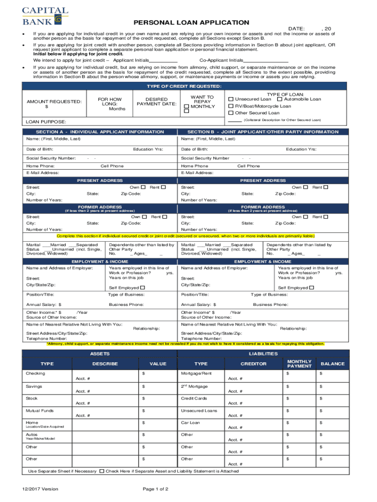 PERSONAL LOAN APPLICATION DATE:, 20If you are applying for individual credit in your own name and are relying on your own income or assets and not the income or assets of another person as the basis