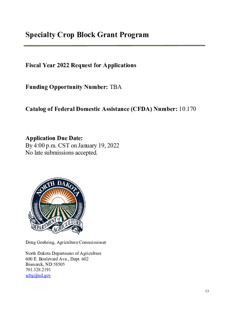 Specialty Crop Block Grant ProgramFiscal Year 2022 Request for Applications Funding Opportunity Number: TBA Catalog of Federal Domestic Assistance (CODA) Number: 10.170Application Due Date: By 4:00