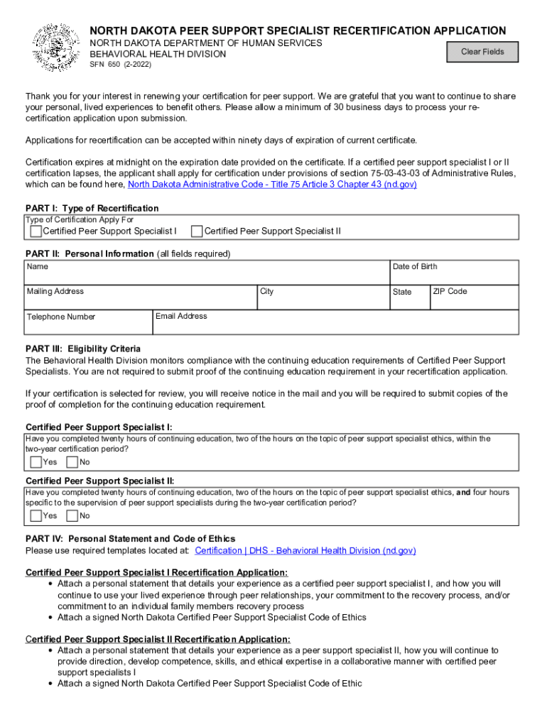 NORTH DAKOTA PEER SUPPORT SPECIALIST RECERTIFICATION APPLICATION