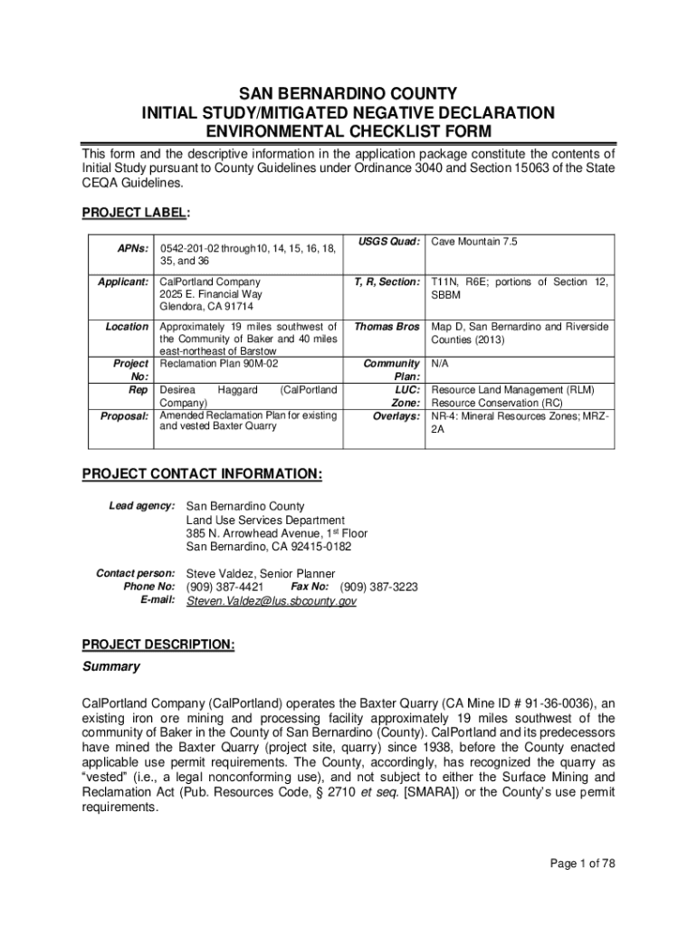 SAN BERNARDINO COUNTY INITIAL STUDY/MITIGATED NEGATIVE DECLARATION ENVIRONMENTAL CHECKLIST From This form and the descriptive information in the application package constitute the contents of Initial