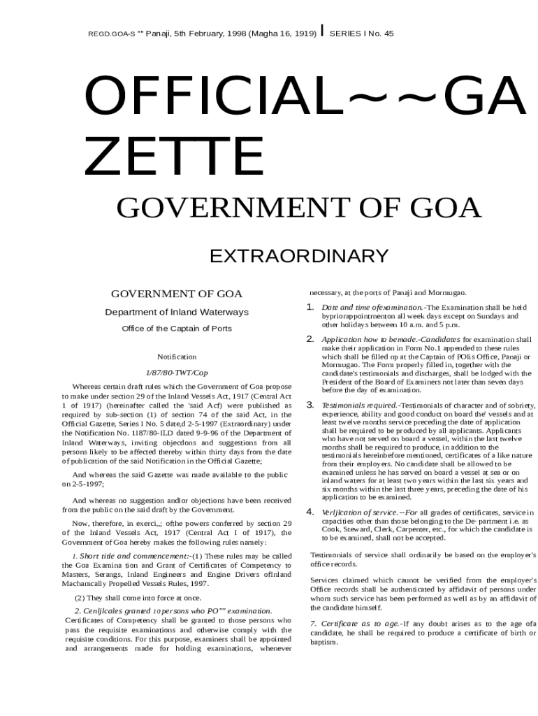 The REGD.GOA-S I SERIES I No. 45 OFFICIALGAZETTE is a fillable form in MS Word extension which can be filled-out and signed for specific purpose. Then, it is provided to the actual addressee in order to provide certain details of certain kinds. The completion and signing may be done in hard copy by hand or with a trusted solution e. g. PDFfiller. These tools help to complete any PDF or Word file without printing them out. It also allows you to edit it depending on your needs and put a valid e-signature. Once finished, you send the REGD.GOA-S I SERIES I No. 45 OFFICIALGAZETTE to the respective recipient or several of them by email or fax. PDFfiller includes a feature and options that make your Word template printable. It provides a number of settings when printing out appearance. It doesn't matter how you will distribute a document - in hard copy or electronically - it will always look professional and firm. In order not to create a new document from scratch every time, turn the original document into a template. Later, you will have a customizable sample.