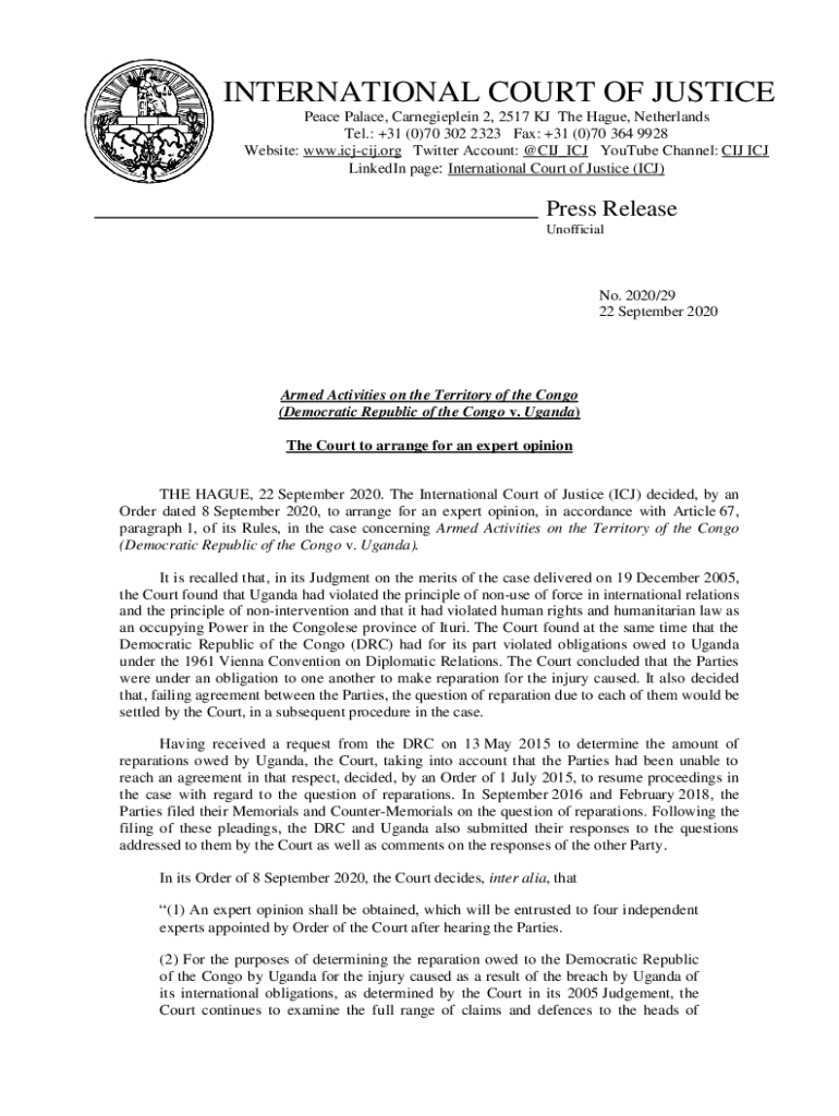 INTERNATIONAL COURT OF JUSTICE Peace Palace, Carnegieplein 2, 2517 KJ The Hague, Netherlands Tel.: +31 (0)70 302 2323 Fax: +31 (0)70 364 9928 Website: www.icjcij.org Twitter Account: CIJ_ICE YouTube