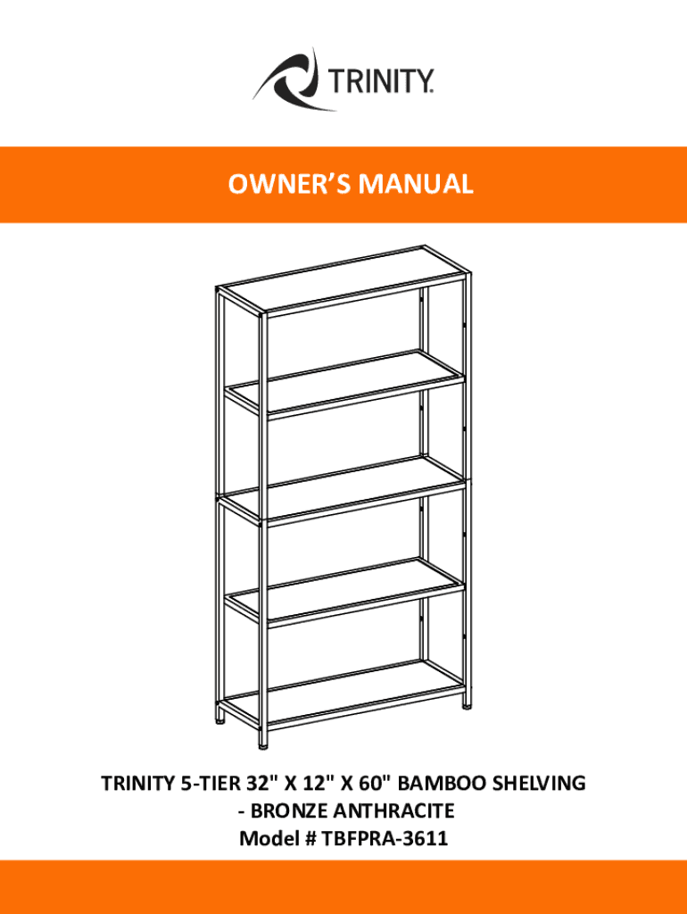 OWNERS MANUALTRINITY 5TIER 32\” X 12\” X 60\” BAMBOO SHELVING BRONZE ANTHRACITE Model # TBFPRA3611PARTS LIST Your TRINITY 5Tier 32\” x 12\” x 60\” Bamboo Shelving should include the following