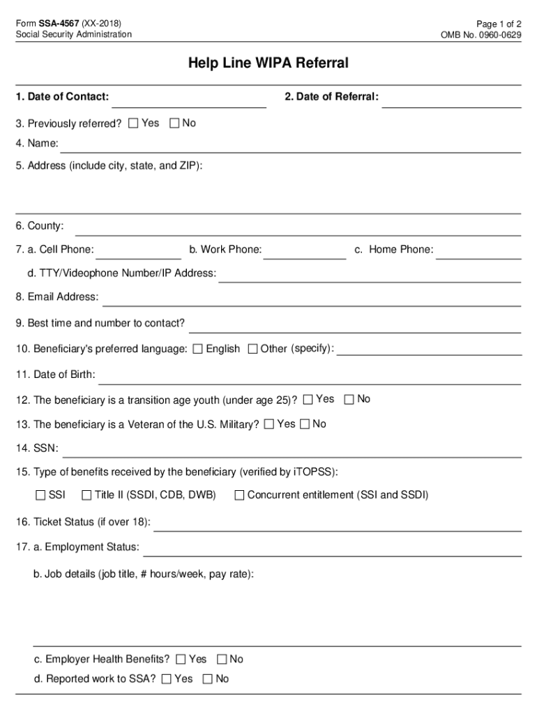 Form SSA4567 (XX2018) Social Security Administration Page 1 of 2 OMB No. 09600629Help Line IPA Referral 1. Date of Contact: 3. Previously referred?2. Date of Referral: YesNo4. Name: 5. Address (include