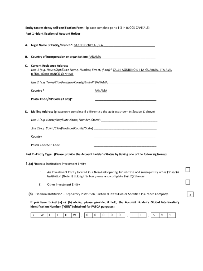 Entity tax residency self certification Form (please complete parts 13 in BLOCK CAPITALS) Part 1 Identification of Account Holder A. Legal Name of Entity/Branch*: BANCO GENERAL, S.A.___ B. Country