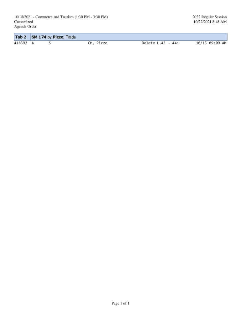 10/18/2021 Commerce and Tourism (1:30 PM 3:30 PM) Customized Agenda Order Tab 2 418592SM 174 by Pizza; Trade A S2022 Regular Session 10/22/2021 8:48 ACM, PizzoDelete L.43 44:Page 1 of 110/15 09:09