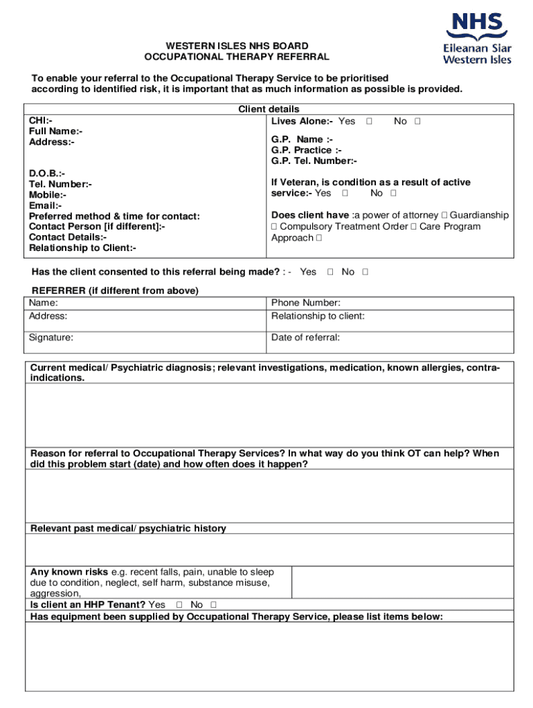 WESTERN ISLES NHS BOARD OCCUPATIONAL THERAPY REFERRAL To enable your referral to the Occupational Therapy Service to be prioritized according to identified risk, it is important that as much information