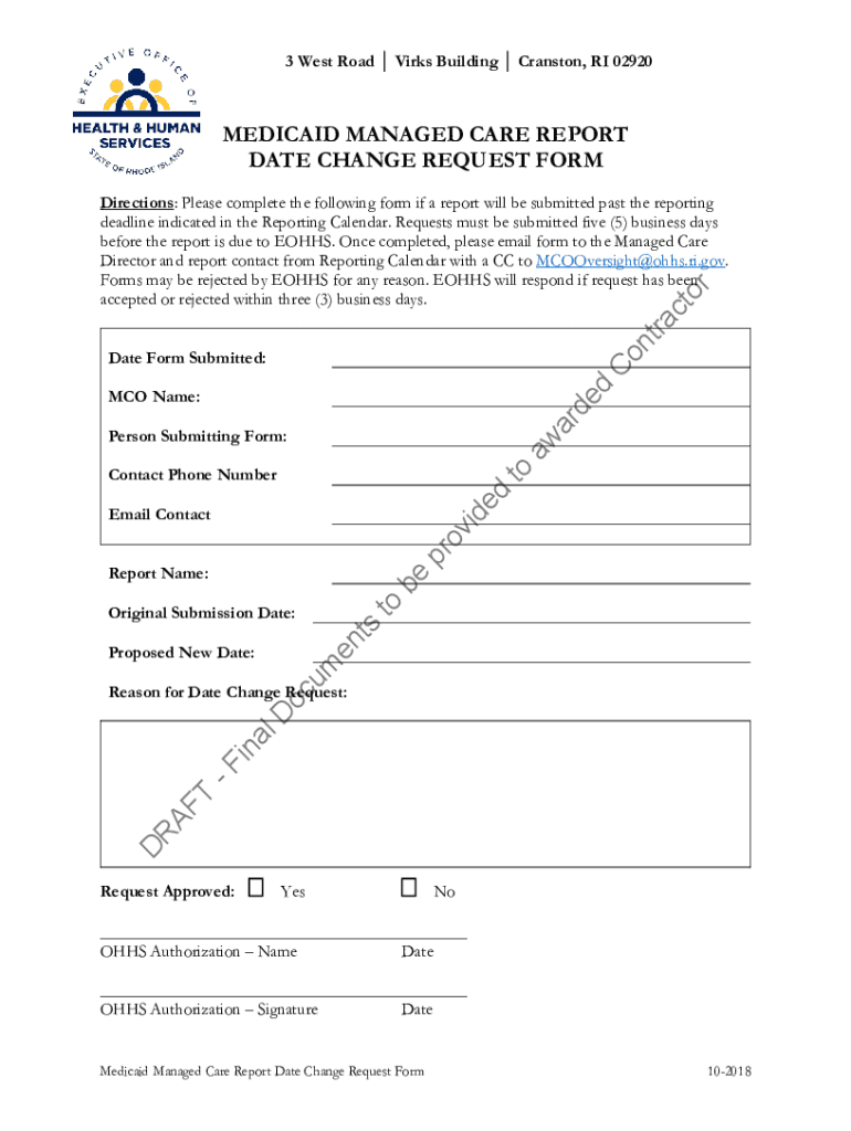 3 West Road Virus Building Cranston, RI 02920MEDICAID MANAGED CARE REPORT DATE CHANGE REQUEST Mormon Trey CTO directions: Please complete the following form if a report will be submitted past the