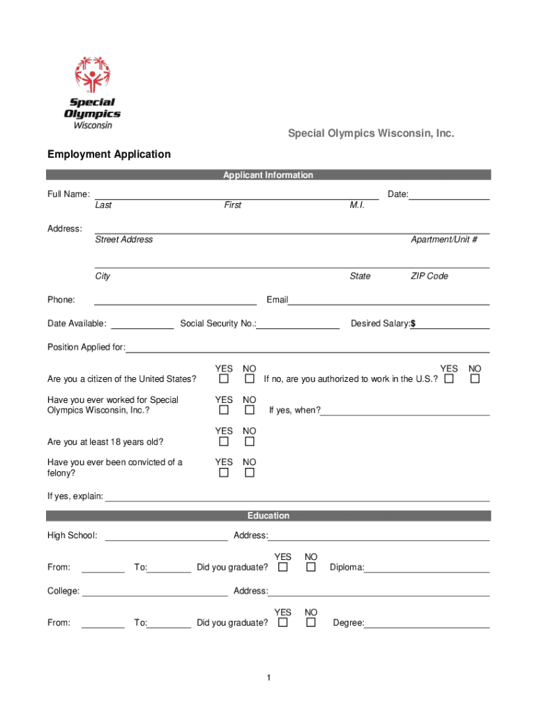 Special Olympics Wisconsin, Inc. Employment Application Applicant Information Full Name:Date: LastFirstM. I. Address: Street AddressApartment/Unit #CityStatePhone:ZIP CodeEmailDate Available:Desired