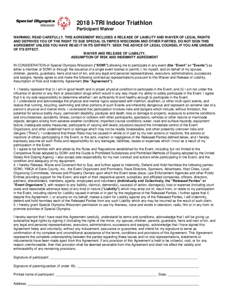 2018 INRI Indoor Triathlon Participant Waiver WARNING: READ CAREFULLY. THIS AGREEMENT INCLUDES A RELEASE OF LIABILITY AND WAIVER OF LEGAL RIGHTS AND DEPRIVES YOU OF THE RIGHT TO SUE SPECIAL OLYMPICS