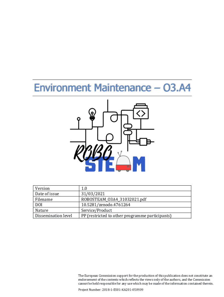 Environment Maintenance O3. A4VersionDate of issueFilenameDOINatureDissemination level1.031/03/2021ROBOSTEAM_O3A4_31032021.pdf10.5281/zenodo.4761264Service/ProductPP (restricted to other program participants)The