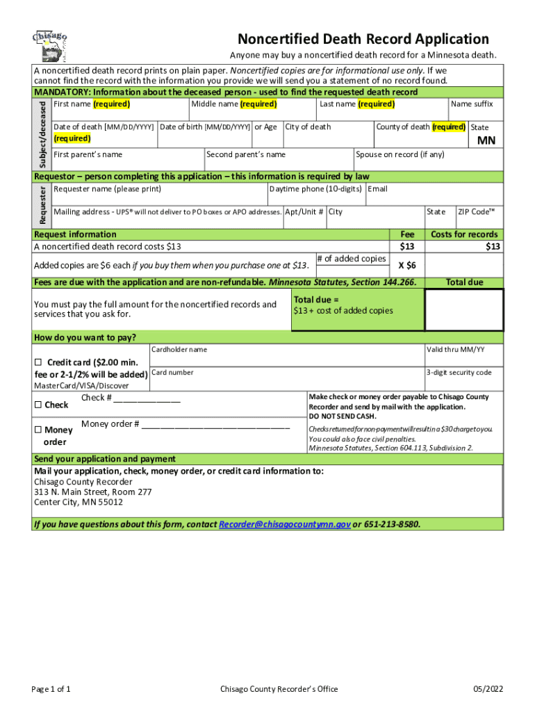 Noncertified Death Record ApplicationAnyone may buy a noncertified death record for a Minnesota death. Subject/deceased noncertified death record prints on plain paper. Noncertified copies are for