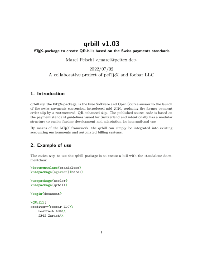 Qr bill v1.03LATEXpackage to create QR bills based on the Swiss payments standardsMarei Pascal marei@peitex.de 2022/07/02 A collaborative project of latex and foobar LLC 1. Introduction qr bill. Sty,