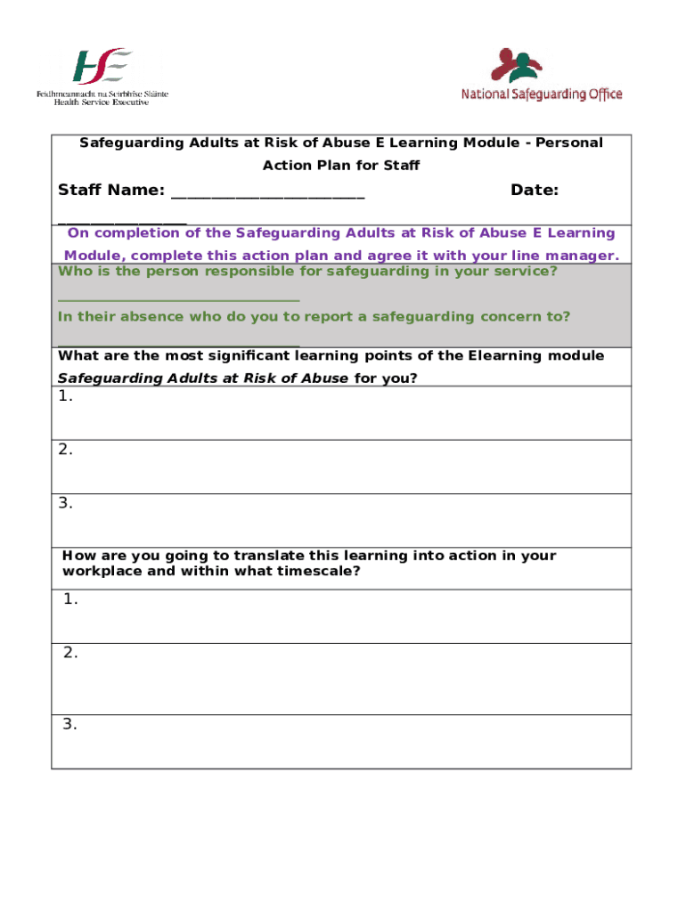 The www.elearningatwork.co.uksafeguarding-adultseLearning At Work - Online Safeguarding Adults Training Course is a Word document that has to be completed and signed for specified purposes. In that case, it is furnished to the actual addressee in order to provide some info of any kinds. The completion and signing is possible or using a suitable tool e. g. PDFfiller. Such tools help to complete any PDF or Word file online. While doing that, you can edit it according to your needs and put legit electronic signature. Once finished, the user ought to send the www.elearningatwork.co.uksafeguarding-adultseLearning At Work - Online Safeguarding Adults Training Course to the recipient or several ones by email and also fax. PDFfiller is known for a feature and options that make your blank printable. It provides a variety of settings when printing out. No matter, how you will send a document - physically or by email - it will always look professional and organized. To not to create a new editable template from scratch again and again, make the original document into a template. After that, you will have a customizable sample.