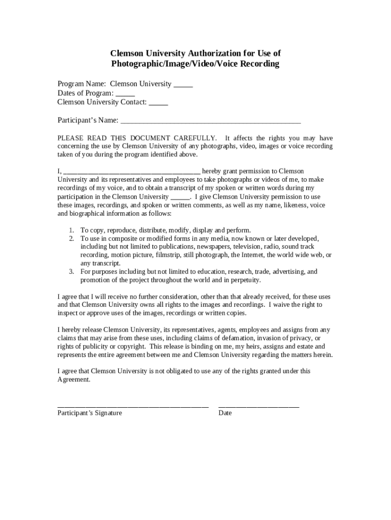 How to fill out www.clemson.eduuniversity-relationsresourcesClemson University Authorization for Use of Photographic ... - media clemson