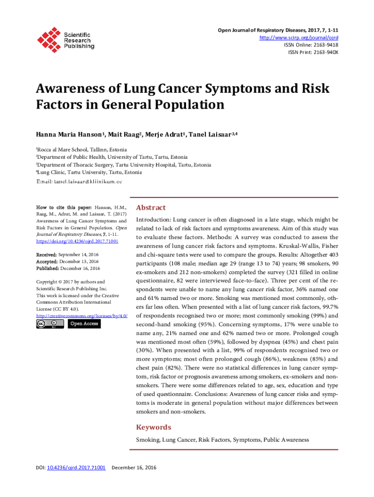 Open Journal of Respiratory Diseases, 2017, 7, 111 http://www.scirp.org/journal/ojrd ISSN Online: 21639418 ISSN Print: 2163940XAwareness of Lung Cancer Symptoms and Risk Factors in General Population