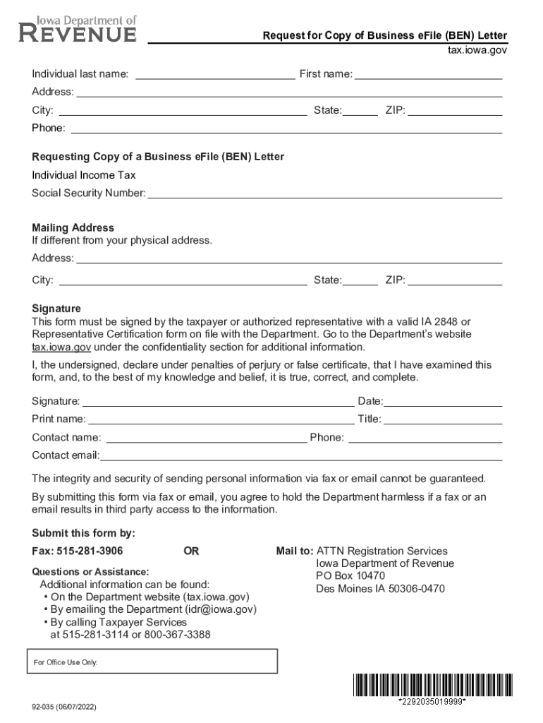 Request for Copy of Business file (BEN) Letter tax.Iowa.gov Individual last name: ___ First name: ___ Address: ___ City: ___ State: ___ ZIP: ___ Phone: ___ Requesting Copy of a Business file (BEN)