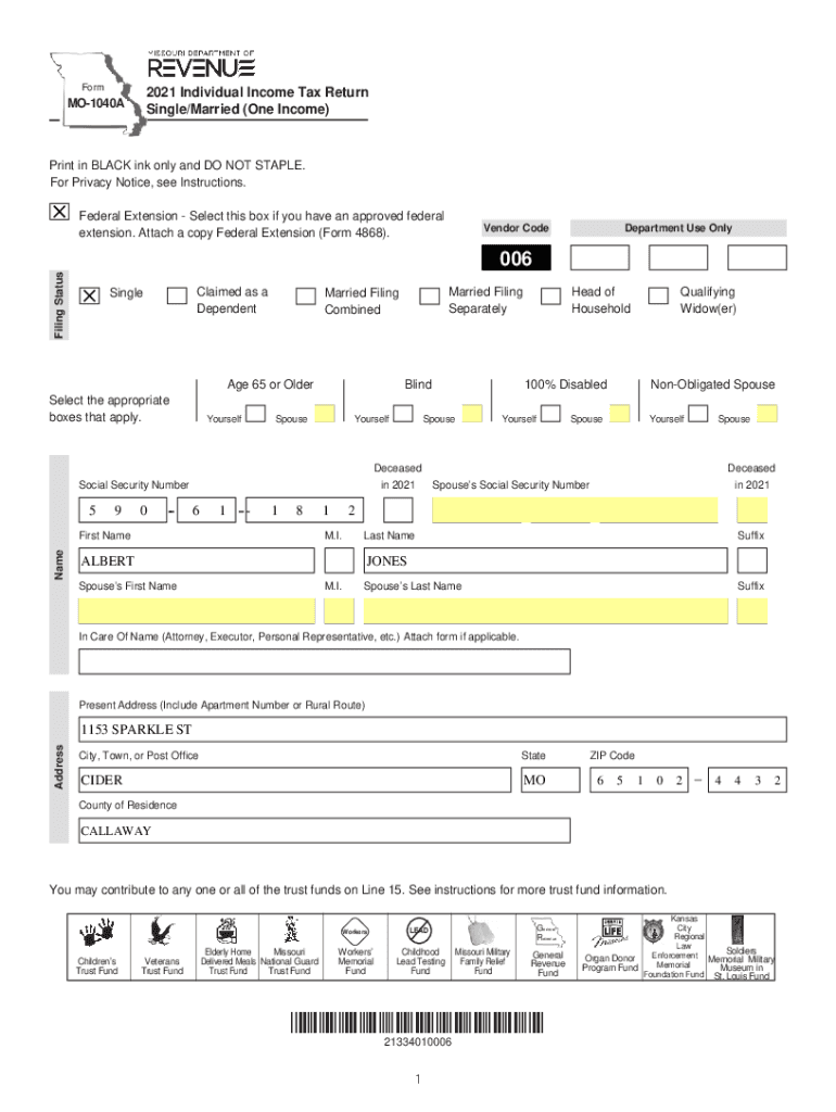 Form2021 Individual Income Tax Return Single/Married (One Income)MO1040APrint in BLACK ink only and DO NOT STAPLE. For Privacy Notice, see Instructions. Federal Extension Select this box if you have