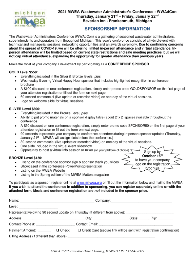 2021 MEA Wastewater Administrators Conference Weapon Thursday, January 21st Friday, January 22nd Bavarian Inn Frankenmuth, MichiganSPONSORSHIP INFORMATION The Wastewater Administrators Conference