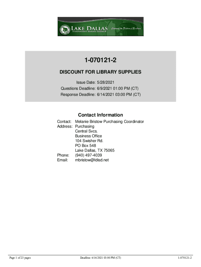 10701212 DISCOUNT FOR LIBRARY SUPPLIES Issue Date: 5/28/2021 Questions Deadline: 6/9/2021 01:00 PM (CT) Response Deadline: 6/14/2021 03:00 PM (CT)Contact Information Contact: Melanie Bristol Purchasing