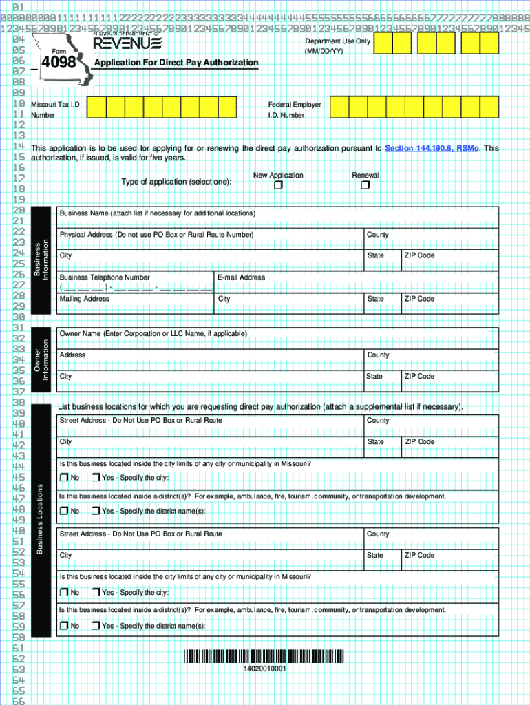 Get the free 4098 - Application for direct Pay Authorization - dor mo