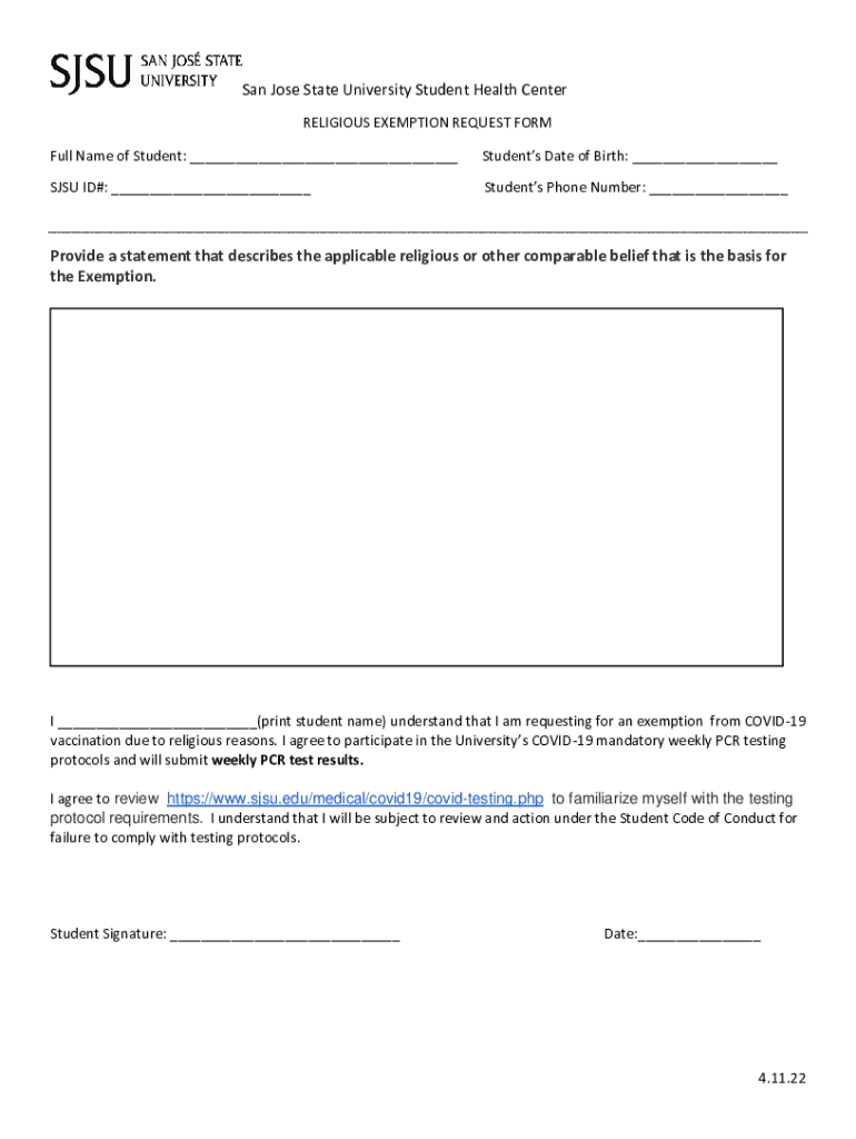 San Jose State University Student Health Center RELIGIOUS EXEMPTION REQUEST FORM Full Name of Student: ___Students Date of Birth: ___JSU ID#: ___Students Phone Number: ___Provide a statement that