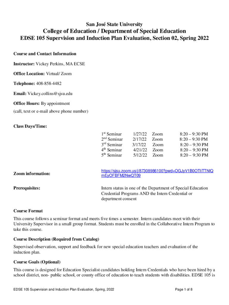 San Jo's State UniversityCollege of Education / Department of Special Education EDGE 105 Supervision and Induction Plan Evaluation, Section 02, Spring 2022 Course and Contact Information Instructor:
