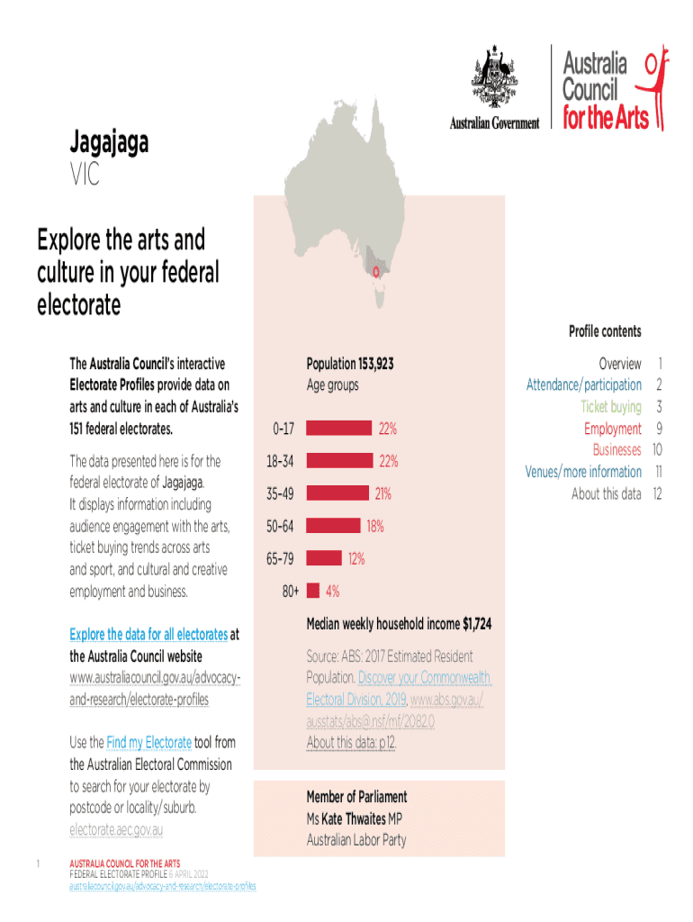 Jagajaga VIC Explore the arts and culture in your federal electorate The Australia Councils interactive Electorate Profiles provide data on arts and culture in each of Australia's 151 federal electorates.