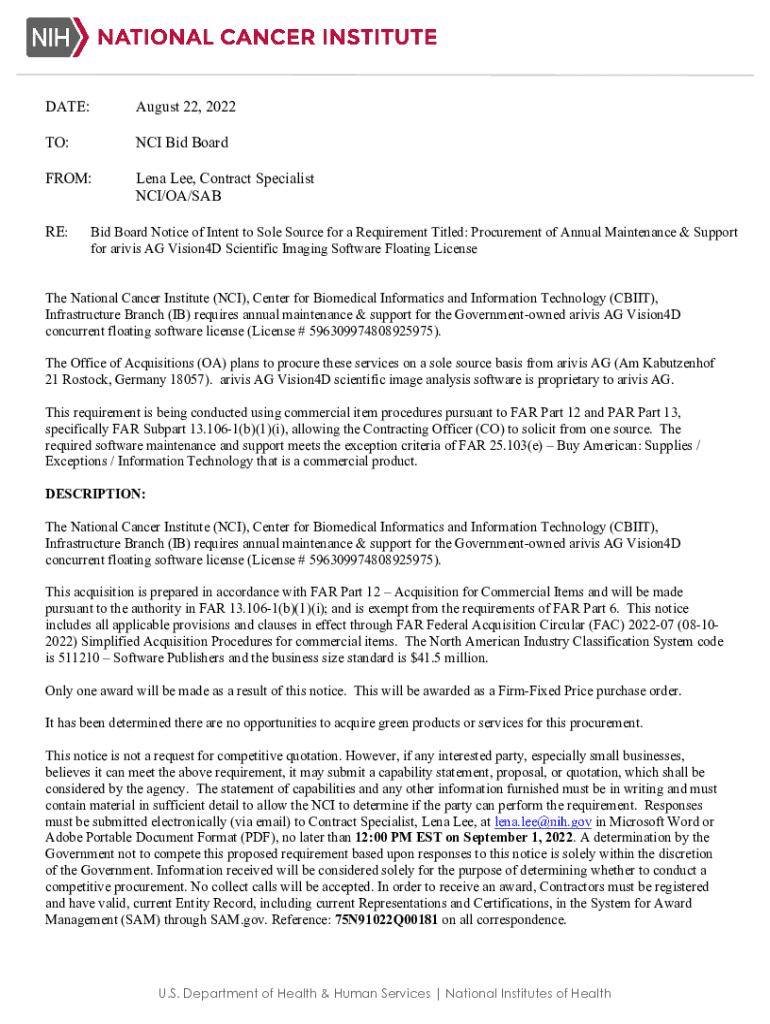 DATE:August 22, 2022TO:NCI Bid Boardroom:Lena Lee, Contract Specialist NCI/OA/SABRE:Bid Board Notice of Intent to Sole Source for a Requirement Titled: Procurement of Annual Maintenance & Support