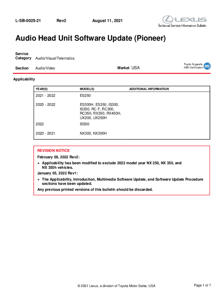 LSB002521Rev2August 11, 2021Audio Head Unit Software Update (Pioneer) Service CategoryAudio/Visual/TelematicsSectionAudio/Mid-market Applicability YEAR(S)MODEL(S)2021 2022ES2502020 2022ES300H, ES350,