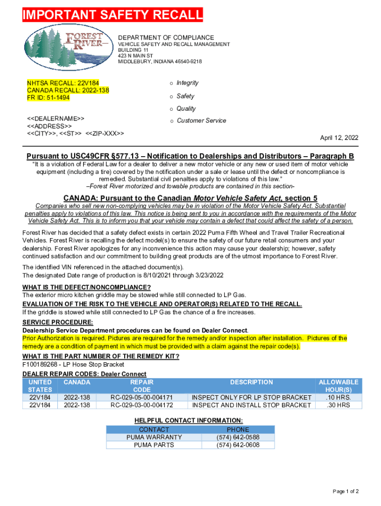 IMPORTANT SAFETY RECALL DEPARTMENT OF COMPLIANCEVEHICLE SAFETY AND RECALL MANAGEMENT BUILDING 11 423 N MAIN ST MIDDLEBURY, INDIANA 465409218NHTSA RECALL: 22V184 CANADA RECALL: 2022138 FR ID: 511494