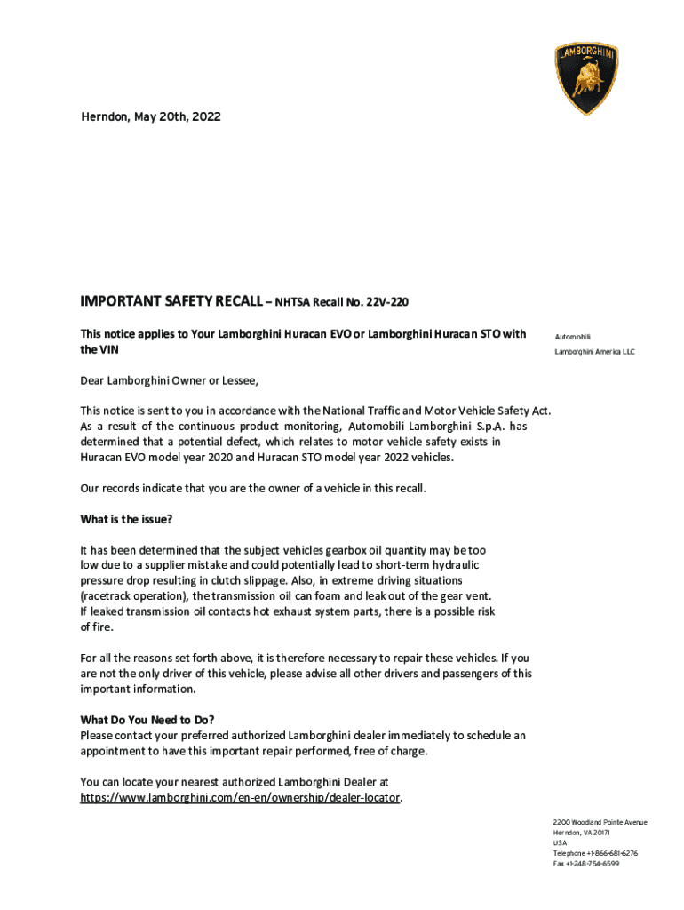 Herndon, May 20th, 2022Automobili Lamborghini America IMPORTANT SAFETY RECALL NHTSA Recall No. 22V220 This notice applies to Your Lamborghini Huracán EVE or Lamborghini Huracán STO with the VINAutomobili
