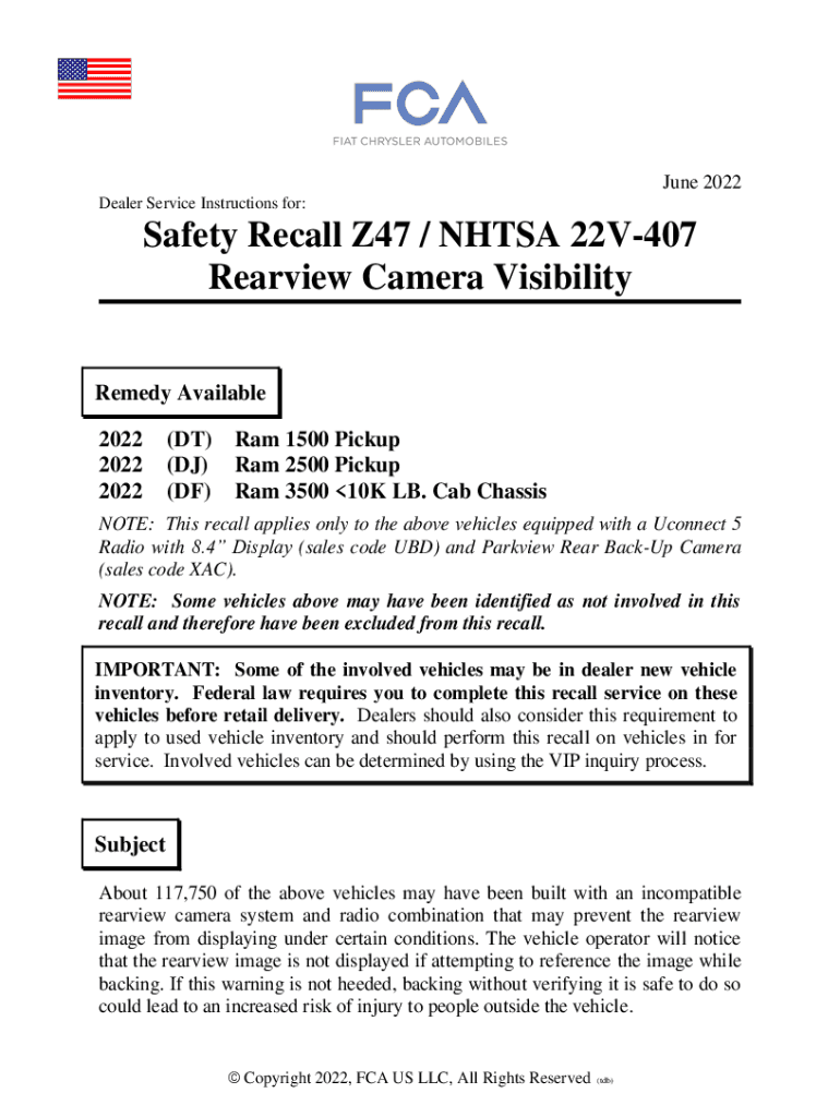 June 2022 Dealer Service Instructions for:Safety Recall Z47 / NHTSA 22V407 Rearview Camera Visibility Remedy Available 2022 2022 2022(DT) (DJ) (OF)Ram 1500 Pickup Ram 2500 Pickup Ram 3500 10K LB.