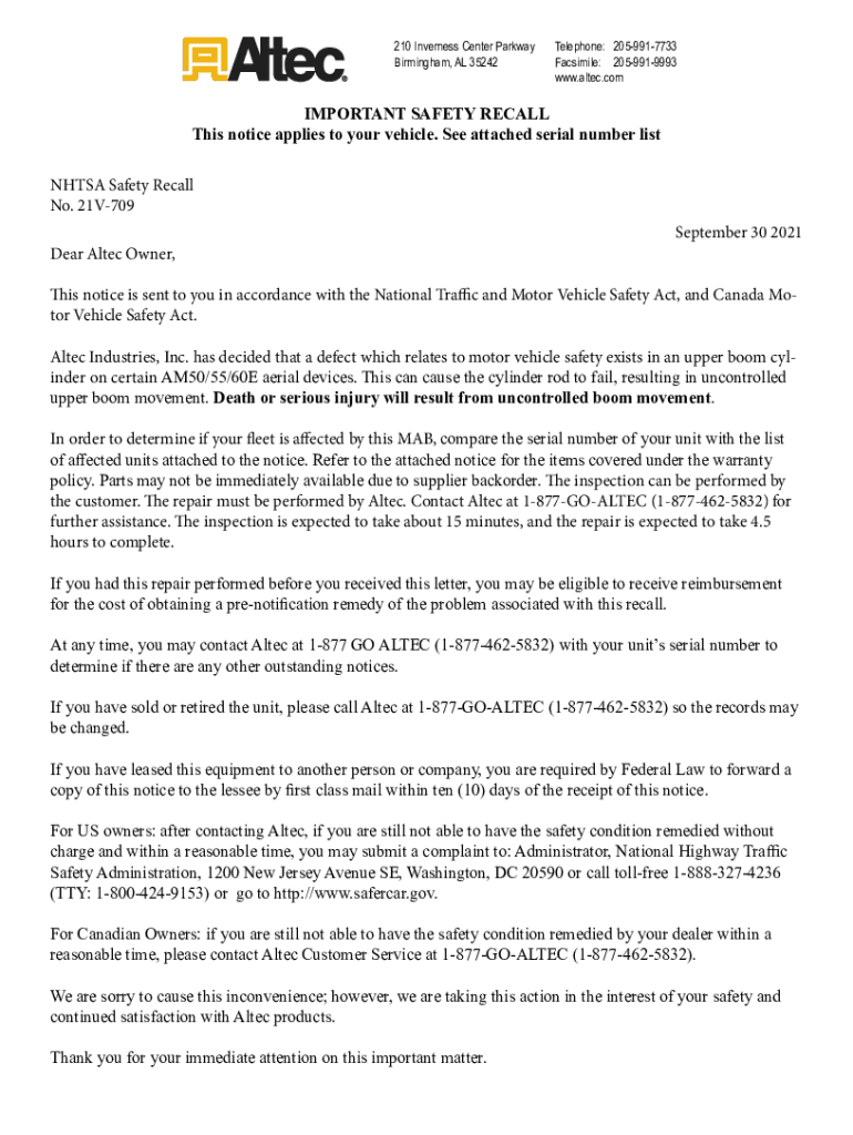 210 Inverness Center ParkwayTelephone:2059917733 Birmingham, AL 35242Facsimile:2059919993www.alter.important SAFETY RECALL This notice applies to your vehicle. See attached serial number list NHTSA