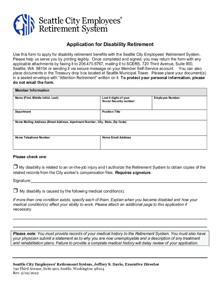Application for Disability Retirement Use this form to apply for disability retirement benefits with the Seattle City Employees Retirement System. Please help us serve you by printing legibly. Once