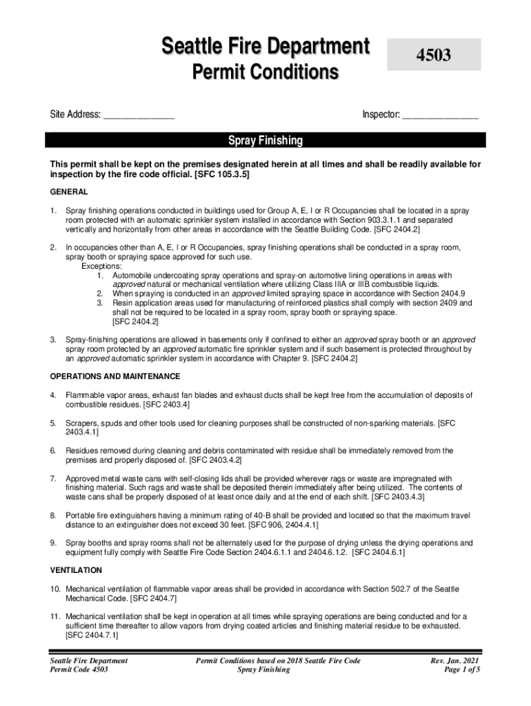 Seattle Fire Department Permit Conditionality Address: ___4503Inspector: ___Spray Finishing This permit shall be kept on the premises designated herein at all times and shall be readily available